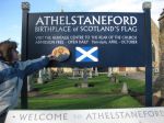 Today the plaque got to pose in front of the museum dedicated to the birth of the Saltire. The flag of Scotland is said to have originated at what is now Athelstaneford, East Lothian when the cross was seen in a vision by a 9th century Scottish king. Unfortunately the museum closed at the end of October but we stopped by anyway so my sister could read the information plaque and we could take pictures with the lovely blue sky to match the blue in the saltire.